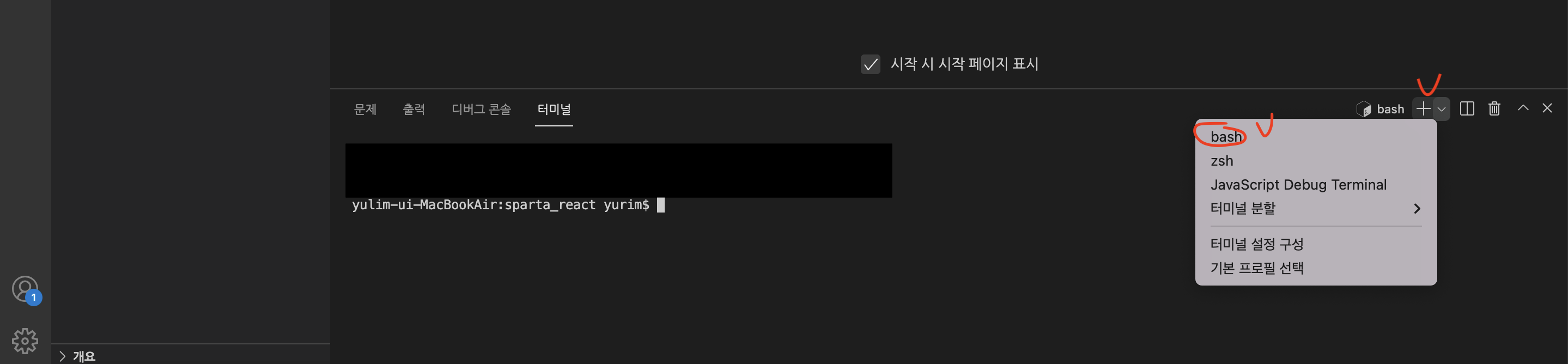vsc > 터미널 > 새터미널 열기 > 아래와 같은 창이 나오면 bash 로 바꾸기 (음 맥북이신분들은 따로 안바꾸셔도 됩니다. 전 zsh로 했어요)