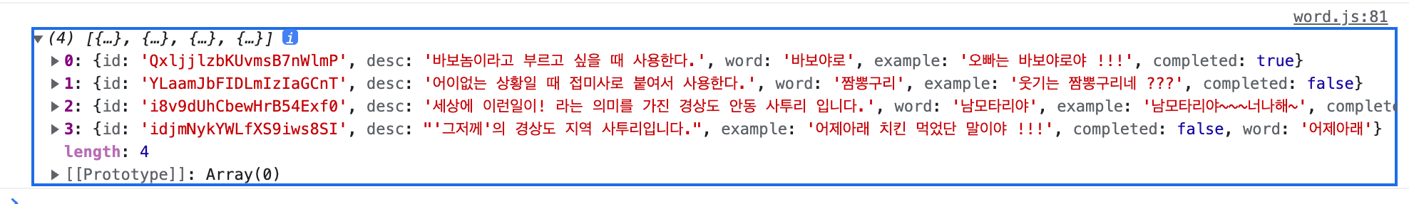 아래의 new_word_list를 클릭해보면, 내가 클릭 한 것의 completed값이 true로 바뀐 것을 확인 할 수 있었다.