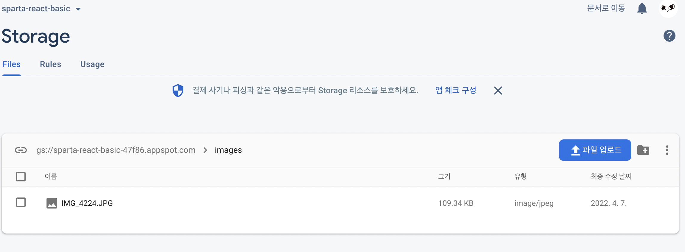 이렇게..!!! 파이어베이스 스토리지에 이미지가 잘 들어온 것을 확인할 수 있다.