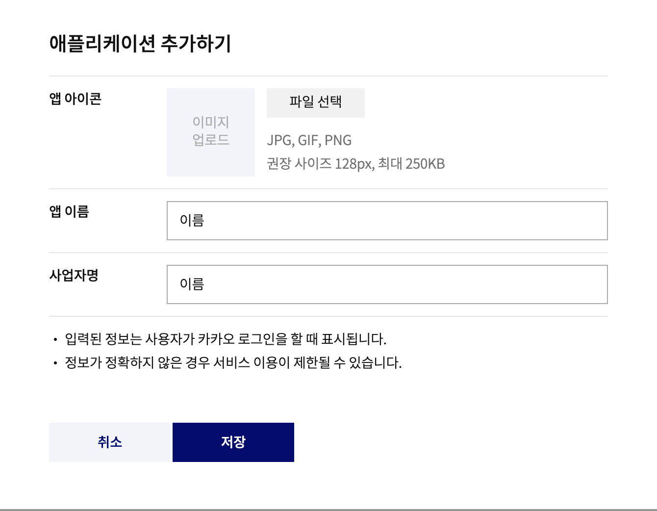 앱이름, 사업자명 입력 후 저장하기 클릭