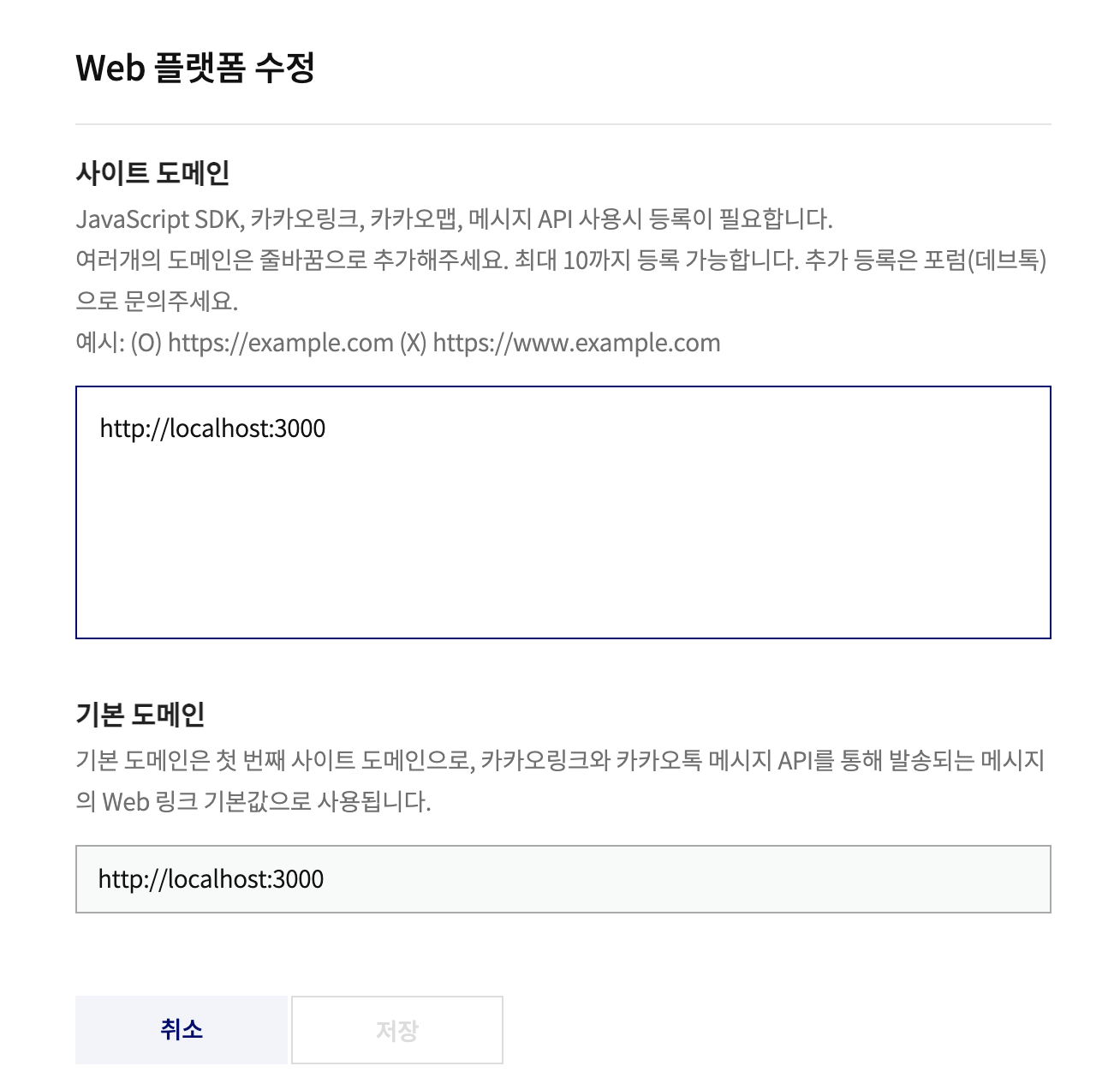아래에 있는 플랫폼 중에서 Web플랫폼 추가해두기 도메인은 http://localhost:3000으로 입력